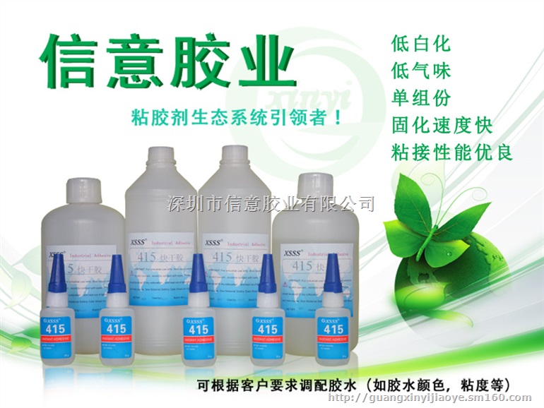 广信意胶业有限公司生产和销售的“XSSS”400快干胶系列。低白化,高强度。通用及常用型其对于金属、塑胶、橡胶以及惰性材料与常规材料粘接。415其粘度高,决定其填充性;可达填充缝隙之间,起到快速固定和粘接作用,其成分:a -氰基丙烯酸甲氧基乙酯Methoxyethtl cyanoacrylate Adhesive低白化,低气味,单组份,中速固化,粘接材料广泛,特别适用于P+R.....电器、仪表、机械、电子、光仪等行业及适用。
