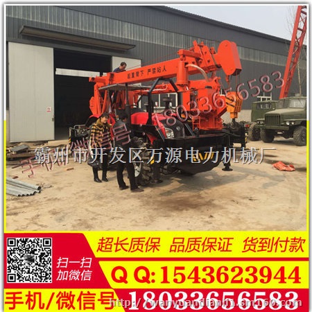 吊15米杆挖坑机 拖拉机打桩吊车一体机 拖拉机起重机 120000元整为本厂独立研发的新型工程设备,该设备采用四轮驱动的拖拉机作为动力,集合钻孔挖坑,吊装电杆为一体,挖坑直径可到达。0.6米,标准深度:3米。吊15米杆挖坑机拖拉机打桩吊车一体机 拖拉机起重机 120000元整特点:全部采用液压控制,操作方便,单人即可完成操作,钻孔速度快,钻孔速度快,再普通黄粘土层最快钻孔速度为47秒,钻孔直径为500mm,深度为1米.再硬土层例如:路基,地基,保证没有大块石头的情况下钻孔速度为2分钟,冻土层可配冻土钻头钻孔速度为5分钟左右。吊15米杆挖坑机 拖拉机打桩吊车一体机拖拉机起重机 120000元整钻头安装在第二节吊臂上,实现了跨沟跨距钻坑。本机可旋转360度,在主体不动的情况下可旋转钻坑吊杆,大大提高了工作效率。吊15米杆挖坑机 拖拉机打桩吊车一体机 拖拉机起重机120000元整为前置式钻孔,比其他厂家后置式钻孔机,操作简单。吊15米杆挖坑机 拖拉机打桩吊车一体机 拖拉机起重机 120000元整采用554或804拖拉机,马力大,动力充沛。钻孔无需清土,一个人即可完成工作,钻到深度后,可靠吊臂提起,土都附着在螺旋叶片上,很少有回落。提起后只需将钻杆正反转动记下土就会自然落下。吊15米杆挖坑机 拖拉机打桩吊车一体机拖拉机起重机 120000元整可以实现单人操作,车到孔成,随钻随走。大大提高工作效率。吊15米杆挖坑机 拖拉机打桩吊车一体机拖拉机起重机 120000元整起吊高度分为:13米型、15米型,起吊重量为3T、5T. 采用四轮驱动拖拉机改装而成,越野性能好。吊15米杆挖坑机 拖拉机打桩吊车一体机拖拉机起重机 120000元整大大摆脱了普通吊车收地形限制的局限性,可以方便引用于狭窄的小巷,乡间田野,水田,丘陵等地带。特别适合于电力施工单位及其他在狭窄区域能作业的施工单位。