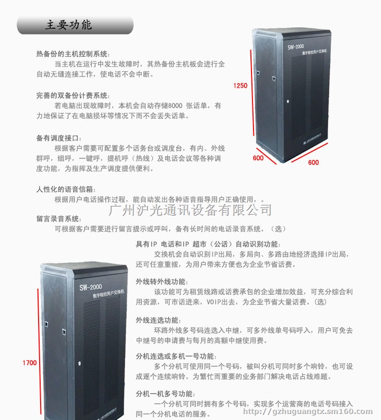 广州沪光通讯科技有限公司是集科研、开发、生产和销售为一体的高新技术企业,通过ISO9001国际质量管理体系认证的企业,拥有程控电话交换机开发生产基地和电源生产基地,技术力量雄厚,产品遍布国内各省市自治区,多年来我公司不断引进世界先进科技成果,陆续研制开发了HJD-80、HG-208、416、HJD-256、SW-2000型、和JF计费管理系统和集团电话,数字程控用户交换机。沪光程控电话交换机以超凡的品质,理想的价格,是您未来商务办公、语音交换通话的最佳选择。详情请咨询沪光通讯公司,诚招程控电话交换机经销商