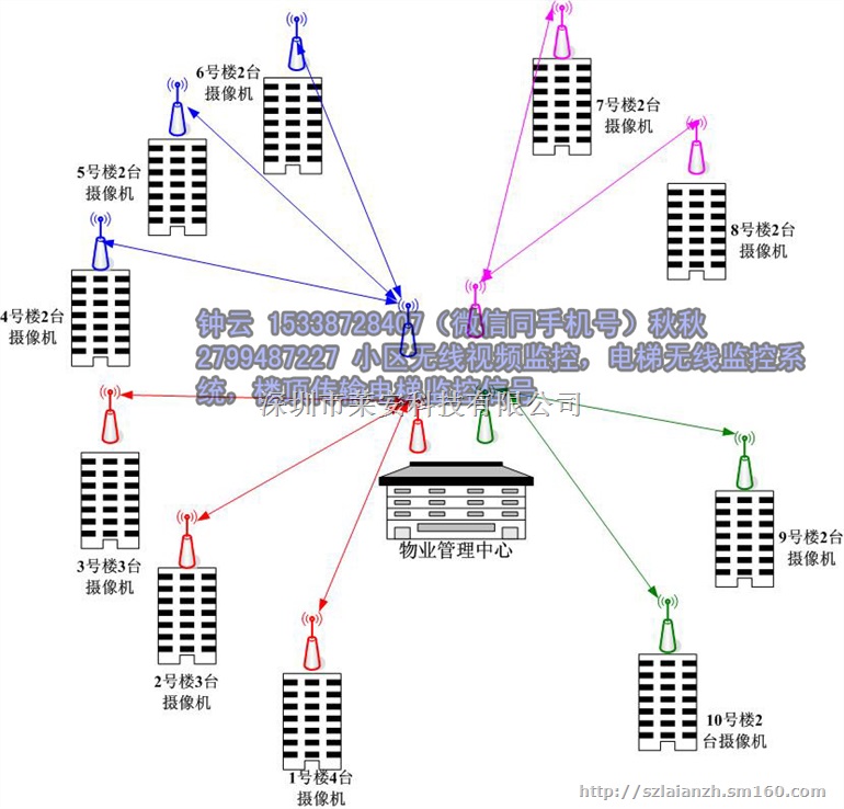 项目前期,每栋楼内部的电梯摄像机信号已经全部集中到楼顶。然后通过交换机汇,每一栋楼安装一台LA-5830F室外天线一体化无线网桥,物业管理中心外围装4台同样的LA-5830F天线一体化无线网桥。图中每种颜色代表一组无线组网,通过无线设置,保证一组3台或者4台组网传输信号。