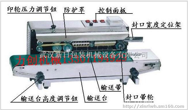 1、该机由机架、减速调速传动机构,加热散热机构,封口印字机构,输送装置及电器电子控制系统等部件组成。
