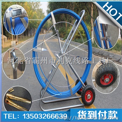 穿管器主要用于地下水管道、墙壁管道中牵引导绳、电缆电线电话线等,对于在管道中牵引引导绳是优秀的辅助工具,光滑又富于弹性的表面可使穿管器轻松地通过狭窄的通道。穿孔器由三部分构成:铜芯、玻璃纤维加强层、高压低密度聚乙烯防护层(平滑、坚固,可抵抗恶劣环境)。铜芯导体使捅条可以用不同方式轻易安放。穿管器具有省时,省力,提高工效等优点,可用于电信管道清洗及光缆,电缆和塑料子管的布放。使用时首先将玻璃钢覆杆由引轮引出,然后与相应的金属头联接,穿入管路内。用于清理时,引导头带动清理工具,可以清理管道;用于布放电缆时,可先将钢丝或铁线带入,尔后用钢丝或铁线牵引电缆入管。穿管器直径分为:4.5/5/10/11/12/13/14/15/16mm 长度从30米-350米均可生产。建筑施工引线用墙壁穿线器,长度30m、50m。