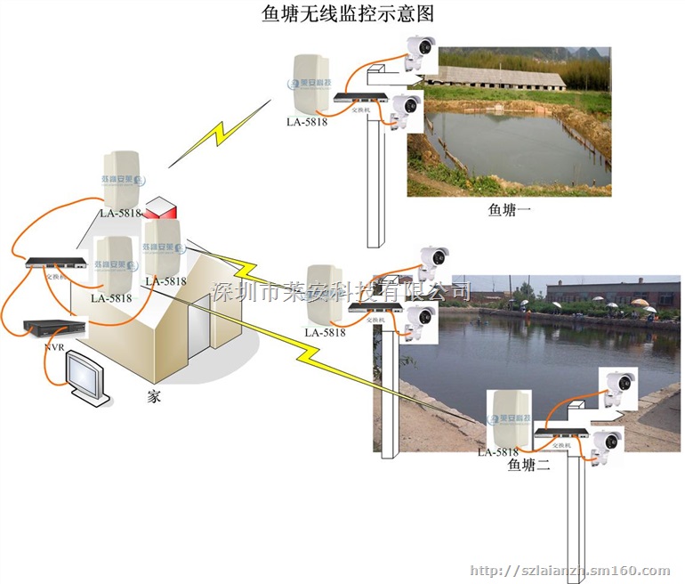 有二个鱼塘,在鱼塘一立1根杆,杆上装2个摄像头,鱼塘二立2根杆,各安装2个摄像头。信号需要传到家里。传输最远距离不超过500米,建议采用数字微波。