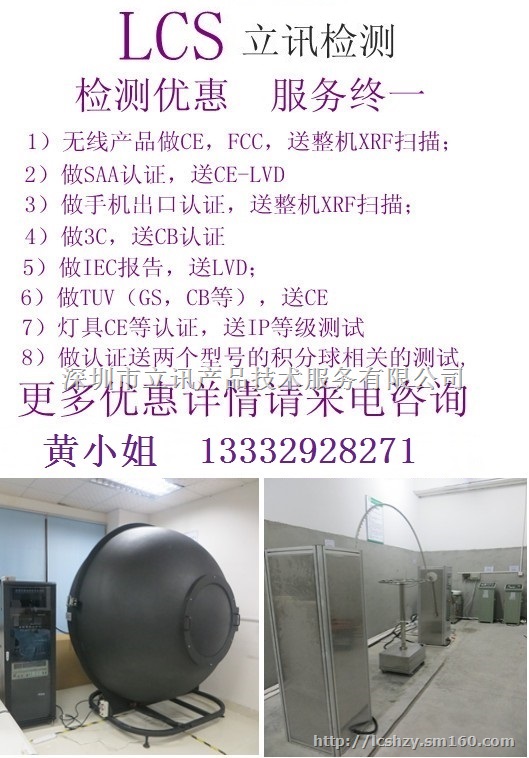 深圳立讯检测股份有限公司,是专业从事CCC、CE、ROHS、FCC、FDA、UL、PSE、CB、KC、SAA、C-TICK、COC、EK-Mark、VDE等认证,是中国较早从事产品认证测试和代理的专业公司,实验室通过UL、TUV授权,可直接进行小家电,IT产品,视听数码产品等测试。公司由多年从事国际认证的资深工程师和测试工程师组成。目前已经建成一定规模的电磁兼容(EMC),安全(safety)和化学检测实验室。并经由德国EMCC、TUV,美国TIMCO,SIEMIC,欧盟ECO,加拿大CSA等国际机构认可与授权,CNAS认证认可编号:L4595