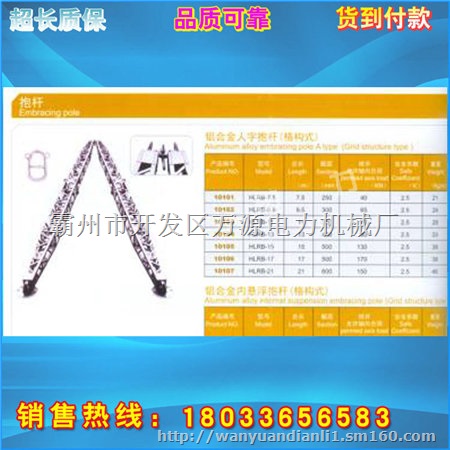 如果您为线路施工组立线杆费时费力而苦恼,请选用我厂生产的立杆机,人字抱杆,立杆器 铝合金立杆机本厂生产的铝合金立杆机采用国标铝合金型材制作而成,立杆机具有重量轻,负荷大,操作简便,是您电力施工中的好帮手。最低的立杆机价格买到最好的产品我厂产品最安全可靠。我厂专业咨询热线:18033656583您可以随时致电我们!24小时专业资深销售为您解答 另外,我厂还可为您的工程量身配置一整套电力施工需要的工具 质优价廉品质保证 您用的满意是我厂生产动力宗旨。