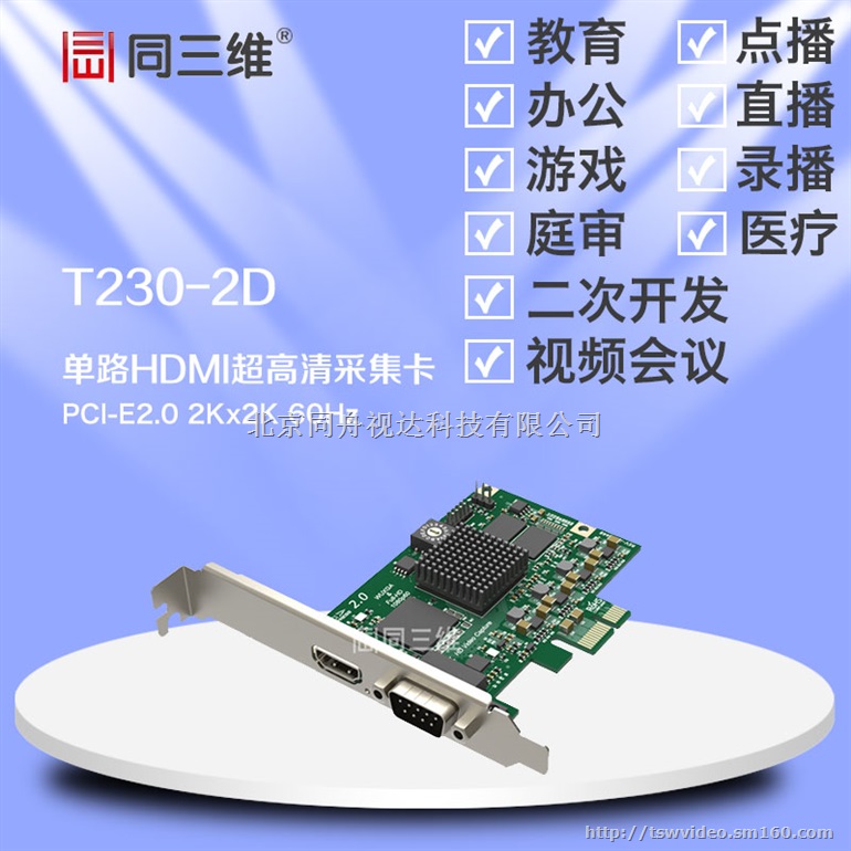 同三维T230-2D是单路(1路)HDMI/DVI超高清音视频采集卡,可采集一路HDMI/DVI超高清音视频信号,或者一路高清分量(YPbPr)视频信号或1路标清复合视频(CVBS)、S端子视频信号+ 1路立体声模拟音频信号,PCI-E2.0 X1 ,输入接口支持HDMI1.4a/DVI1.0,采集卡上有一个HDMI接口和一个转接口(DB9),转接口可以通过配套的转接线分出1路色差分量接口+1路AV接口+1路S端子接口,配件:1条DB9转色差/AV/S端子转接线+1个小档板。支持半高,符合Low-Profile规格,超小尺寸:92.76mm x 68.88mm (不含 PCIe 挡板)