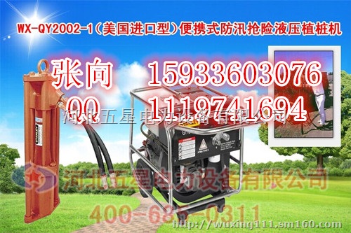 河北五星电力设备有限公司生产的WX-KY2012型气动打桩机(植桩机)用于防洪堤坝加固、抗洪抢险堵口、池塘维护、围栏加固作业(木桩或钢管),与人工打桩相比,具有安全可靠、操作简单、打桩速猛(一分钟可打直径150mm木桩一米)、省力省时。能够在恶劣的环境下连续作业等特点。
