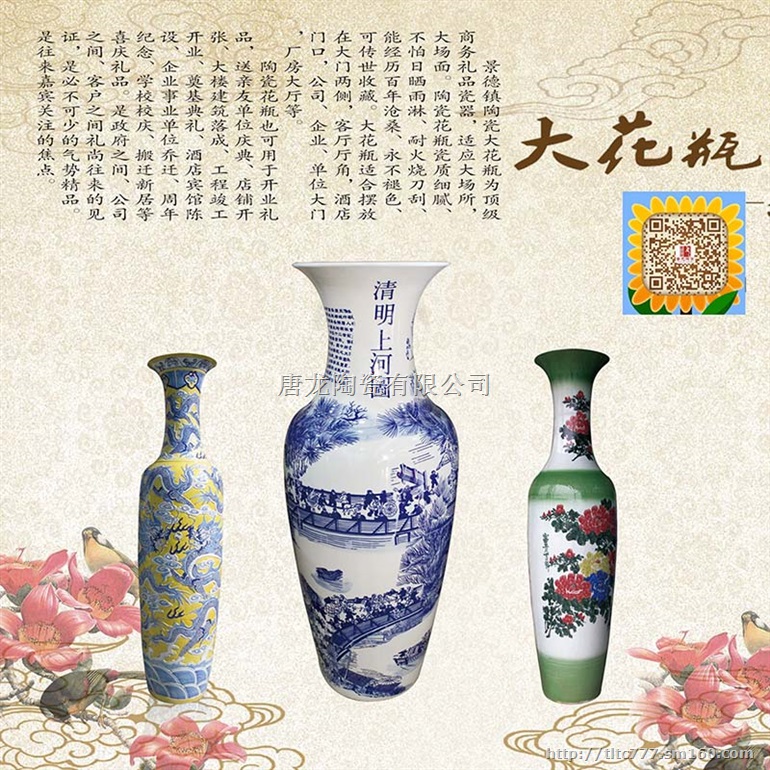 唐龙陶瓷作为一家定制定做的景德镇大花瓶厂家,唐龙陶瓷所生产的景德镇大花瓶不仅有各种大小,还有各种画面供大家选择。无论是手绘还是贴花,我们都有专业的陶瓷设计师为您先设计出画面然后再进行烧制,还可以添加您想要添加的logo和添加您想说的话。唐龙陶瓷景德镇大花瓶是绝对是您实现心中所想的上佳选择。标价为面议价格!