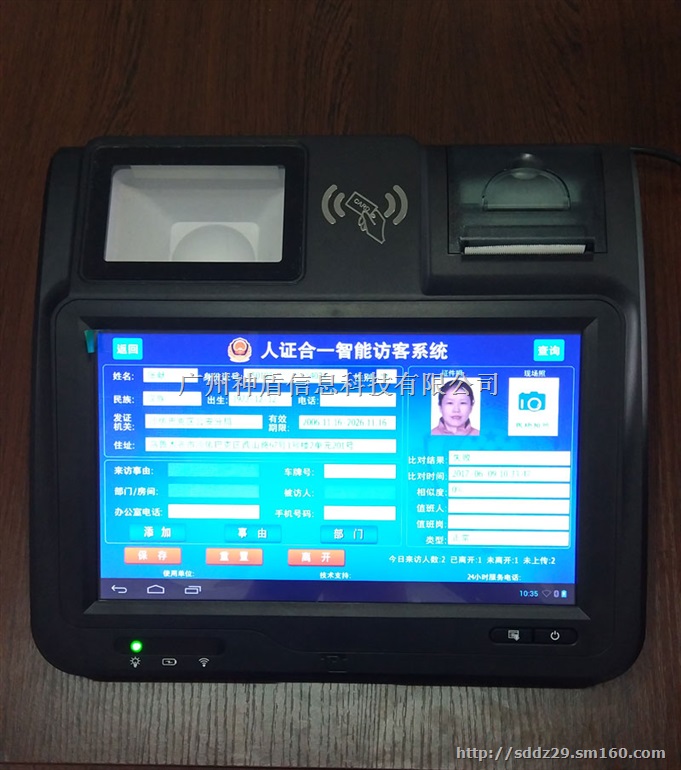 产品概况 智能访客机、自助访客机、扫描打印访客一体机,访客系机通过IC感应、图片采集、物联网等技术为访客管理从传统的经验向现代化、网络化、动态立体化的科学管理型转变提供信息共享的有效手段,以最适用的技术体系,结合*的人脸比对,达到人证合一,数据实时上传警综合平,最现实的配置方案切实满足当前业务需求。一、产品优势1、外观精美 整机注塑成型,外观精美、大方、颜色可根据客户需要定制; 2、维护方便 整机流线型设计,符合人体工学原理,人性化操作界面,结构合理、 便于维护;3、功能全面 整机内置双二代身份证、高清数码自控摄像头、证件扫描仪、热敏打印机、条码扫描枪等;二、产品特点:◆10.1寸触摸屏操作◆身份证识别,可快速识别身份证信息◆高清人脸识别验证,支持来访人拍照◆可发放IC智能卡,安全管理出入访客◆支持指纹认证或打印访客单◆超高清显示屏,高清、防刮、防摔、防爆◆超长待机,持久续航◆高触感屏,防水设计,不必担心屏幕溅到水三、产品参数:外形尺寸:220*215*75mm 包装尺寸:280*260*135mm重量标配:小于1.0kg按键:一个开机键,一个拨码开关操作系统:Android4.4,支持多语言CPU:Cortex-A9 双核 主频1.6GHzRAM:DDR3 1GBROM:NandFlash 4GB扩展卡槽:Micro SD卡槽一个(*支持32G扩展),SIM卡槽1个,PSAM卡槽2个(可选)显示屏:10寸TFT-LCD屏,LED背光,分辨率1024*600,电容触摸屏,支持多点触控打印机:58mm热敏打印机,打印速度60mm/s,支持GB2312及ASCII码字库WIFI:支持IEEE 802.11b/g/n,802.3,802.3u喇叭:内置喇叭USB接口:USB2.0 2个OTG接口:Mini USB 1个串口接口:DB9公头1个密码键盘接口:RJ-11 串口 1个以太网接口:RJ-45 1个(10M/100M自适应)电源接口:DC12V 1个多媒体接口:HDMI 1个音频接口:1组(2孔)钱箱接口:RJ1-11 1个