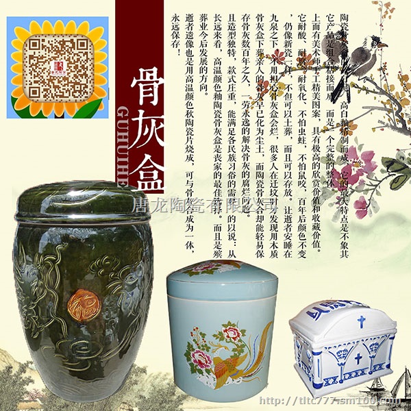景德镇唐龙陶瓷骨灰盒厂家是一家专业定制各类陶瓷骨灰盒批发订制。也是丧家在选择骨灰盒批发的选择!陶瓷骨灰盒批发厂家生产的骨灰盒它耐酸,耐腐,耐氧化,不怕虫蛀,不怕鼠咬,百年出土后颜色不变,仍象新瓷一样。陶瓷骨灰盒因其形制典雅,肃穆庄重,成为许多人仙逝后归宿的首选。