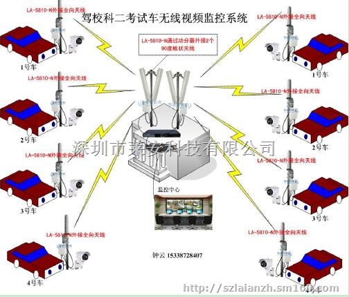 车上安装LA-5810-N大功率室外无线网桥车载端设备,外接全向车载天线,车内连接网络摄像机,网络摄像机可以支持语音播放和采集。当车辆在考试区域内移动时,可以将视频和语音实时地通过无线网桥回传到中心基站,基站通过有线和监控中心连接,实现考试车辆和监控中心的语音/数据/视频传输。共有8台车,共需要LA-5810-N无线网桥外接全向天线。