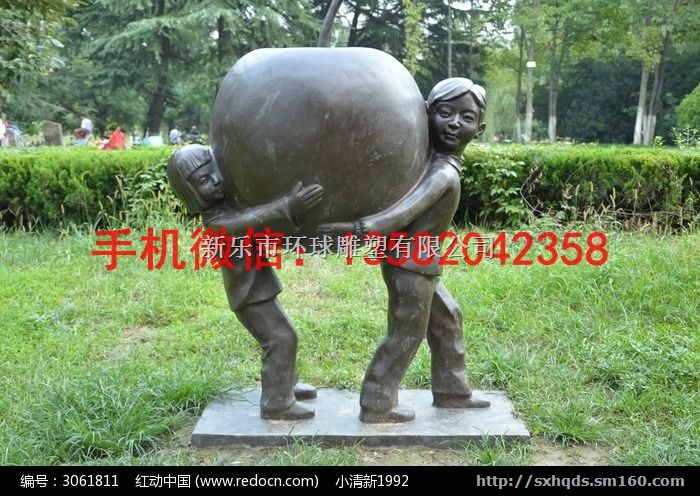 环球雕塑主营产品:两个小孩抱苹果铜雕塑 公园人物铜雕塑 儿童人物铜雕塑