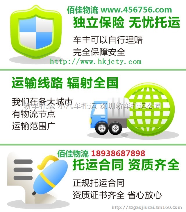 三亚轿车运输公司 三亚小汽车托运公司深圳佰佳小轿车托运公司全国联网、各个城市均拥有轿车??运输托运物流节点,可配载单台轿车运输;深圳佰佳轿车托运公司拥有一批经验丰富的托运专业团队和司机队伍,是一家正规的专业轿车托运公司。公司实行“严谨、高效、监控、完善”的微机网络化管理运作模式,可完成全国范围内所有大中城市之间的商品车(含轿车、越野车、吉普车、面包车、电动车)的托运运输。 深圳小轿车托运公司以承接深圳比亚迪、广州本田、丰田、花都尼桑、及各类进口商品轿车的运输为主体运输项目,同时为社会各界人士提供因出差、旅游、探亲、搬迁而产生的轿车运输托运服务。无论客户身在何处,只要你在百忙中一个电话,我们将安排专业人员提供接车送车,并和你签定轿车托运合同,收费合理安全准时快捷,也许您不能亲眼见证我们整个的运输过程,但你一定可以感觉到我们在每一个环节上为您和您的爱车所提供的完美服务。