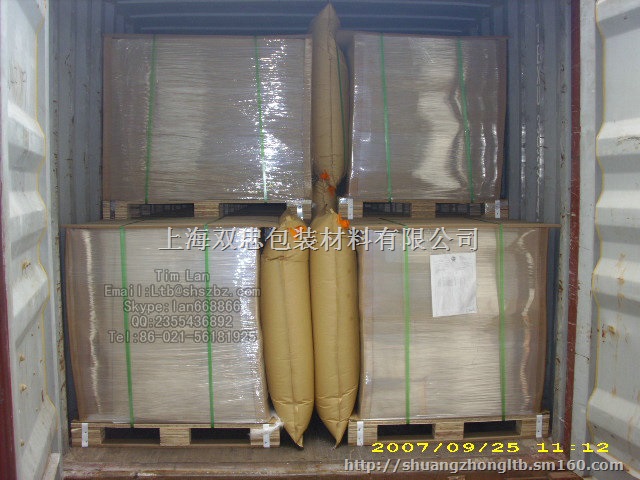 集装箱填充气袋是一种以空压机提供气源充气的填充产品,在其最大的填充空隙空位范围内,可根据空位空隙大小随意调整充气量。它和运输产品也是一个软接触,货物在运输中受到颠簸时,它的减震方法就好像缓冲和吸收,而不是硬顶,这样既保护了产品,又不至于影响其本身的填充效果。