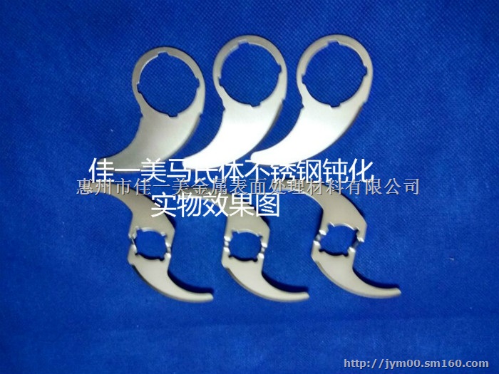 本品采用环保有机酸为主氧化剂,添加阳极吸附中间体助剂,优质缓蚀剂以及少量高份子钝化促进剂化合而成,不含酸蚀成分、无味。通过本品钝化,可有效保证钝化过程中不会破坏工件原色泽,不改变工件尺寸,并提高不锈钢工件的抗盐雾能力。如400系列等无镍不锈钢410、420、430、1cr13、2cr13、3r13所有型号的不锈铁材料,用于提高其工件的耐腐蚀能力,处理后的工件不改变原色泽,耐盐雾能力可提高6至100倍,可达中性盐雾试验780H不生锈。由于钝化处理时会在工件表面生成一层致密而不易破坏的钝化膜,广泛应用于螺丝、紧固件、器械、刀片、马达轴等领域,前景十分广阔。
