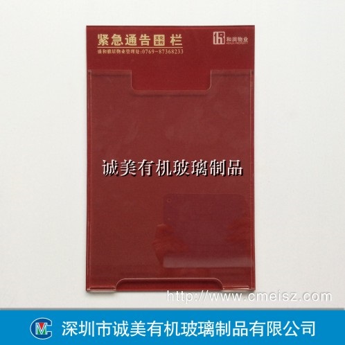 诚美有机玻璃用有机玻璃订制加工的有机玻璃插纸告示牌 带卡槽亚克力公告栏 信息牌等,具有较好的透明性、化学稳定性和耐候性,易染色,易加工,外观优美,高档美观,长久不易退色,不失为做公告栏的材料首选之一。也可以在面上粘上插纸盒,方便更换信息内容,循环利用,节省成本,更好的利用资源。
