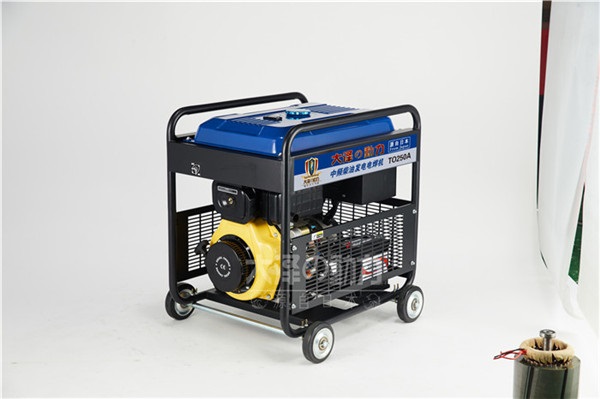 油田使用250A柴油发电电焊两用机 利用正负两极在瞬间短路时产生的高温电弧来熔化电焊条上的焊料和被焊材料,来达到使它们结合的目的。电焊机的结构十分简单,说白了就是一个大功率的变压器