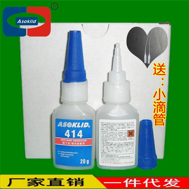 ◆ASOKLID牌-瞬干胶水414 塑料粘接型低腐蚀、耐湿性,耐候性好。用于粘接塑料。抗冲击性能好,抗剥离强度高,能填充间隙。用于各种橡胶, ABS、PVC、PS、PC、PMMA等塑胶,各种钢铁、铝、铜等金属,木材、树脂、TPU等各种材质均可粘接。