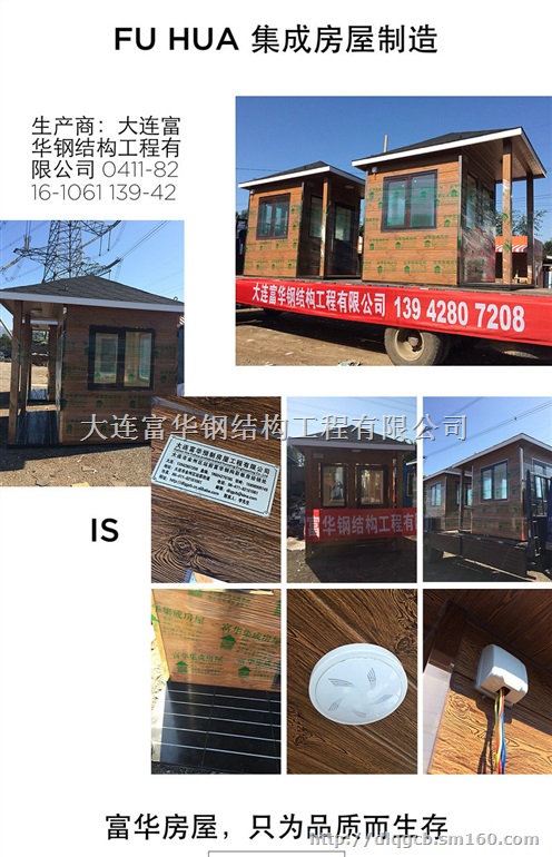 大连富华钢结构工程企业,于2004年成立。是一家专业制造轻钢房屋、集成房屋、移动别墅、轻体房、保安亭、活动房的实力性企业。几年来我处积累了大量经验,技术力量日益强大,产品数量、质量逐年提高,能承接大批量生产任务和各种异型房的建造。企业占地面积8000平方米,现有员工50多人,工程师2人,月生产能力:一万平方米以上。主要生产彩钢集城别墅、集成房屋、景观房屋搭建、复合板活动房、吊装房、可拆装型活动房、新型欧式活动房、别墅、轻钢结构、厂房、仓库、复合板、ZC型、轻钢檩条、安装设计。并租赁移动吊装房,及移动环保厕所。本着“质量为主、用户至上、诚信求实”的企业理念,竭诚为各地广大用户提供产品。