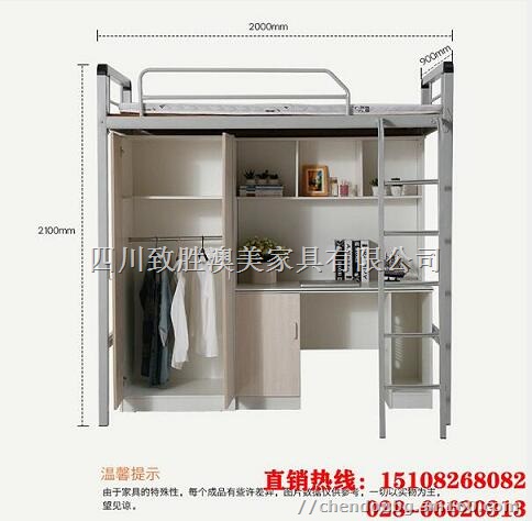 成都员工公寓床柜体整体高度1800mm,进深600mm,衣柜宽度800mm,桌面宽度1100mm,外置储物空间宽度500mm;高度与衣柜一致.