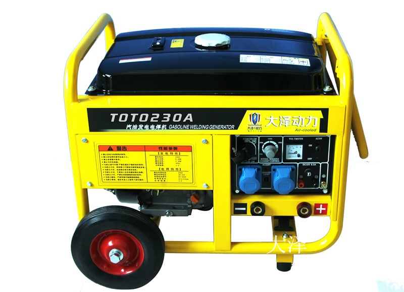 大泽动力采用TOTO230A风冷汽油动力。机器可常态焊接3.0-5.0焊条,移动式230A发电电焊机采用六相半波整流,焊接电流平稳,飞溅少,焊口平滑。还可以输出交流辅助电源,辅助电源功率可达到5KW。普通的自发电焊机在焊接的过程中是不能同时输出辅助交流电源的,如果两者同时工作,就会导致焊接不稳定,机器冒黑烟。可是移动式230A发电电焊机采用的是制感性电机,可以达到焊接,发电两不误,是一款真正可以一机两用设备。而且机器为了便于户外作业,还别定制了万向轮,无论在何种环境下作业,都是很方便移动的,节省了大量的人力和物力,真正满足用户的需求!