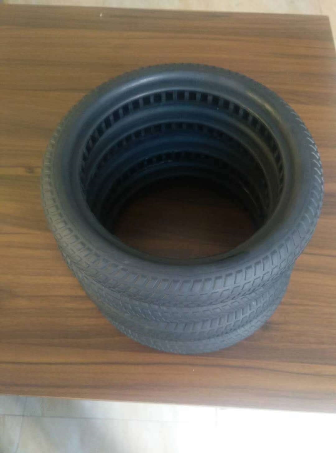 纯橡胶的特点是:耐磨,抓地好防滑,开模周期短(15-18天)。充气轮胎是一样的舒适度,此材料通常用于共享单车,共享电单车和电动车