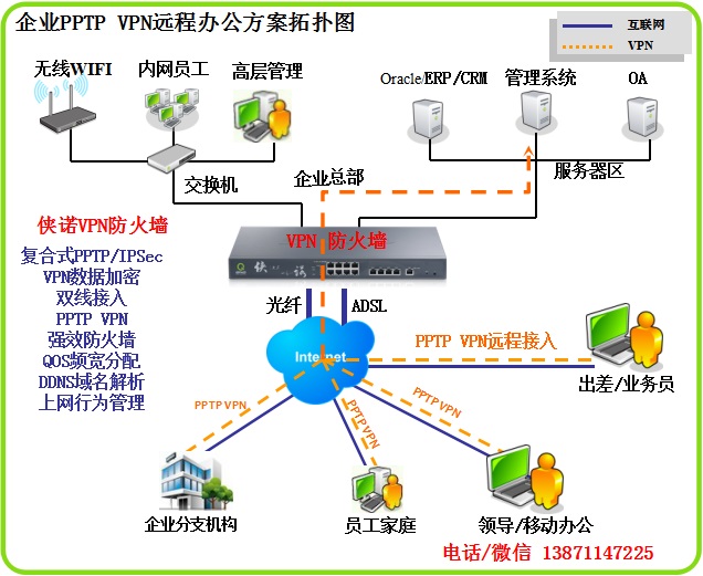 VPN搭建企业远程移动办公异地互联方案,PPTP VPN、IPSEC VPN多种VPN方案。2020年新冠疫情爆发,诸多企业选择居家远程办公,而员工需要在家里或者酒店等异地访问公司内部服务器及相关应用系统,VPN就能很好的解决这一问题,一键联机轻松互联。 侠诺VPN防火墙 销售电话 13871147225 微信同号,武汉市内免费上门安装调试。