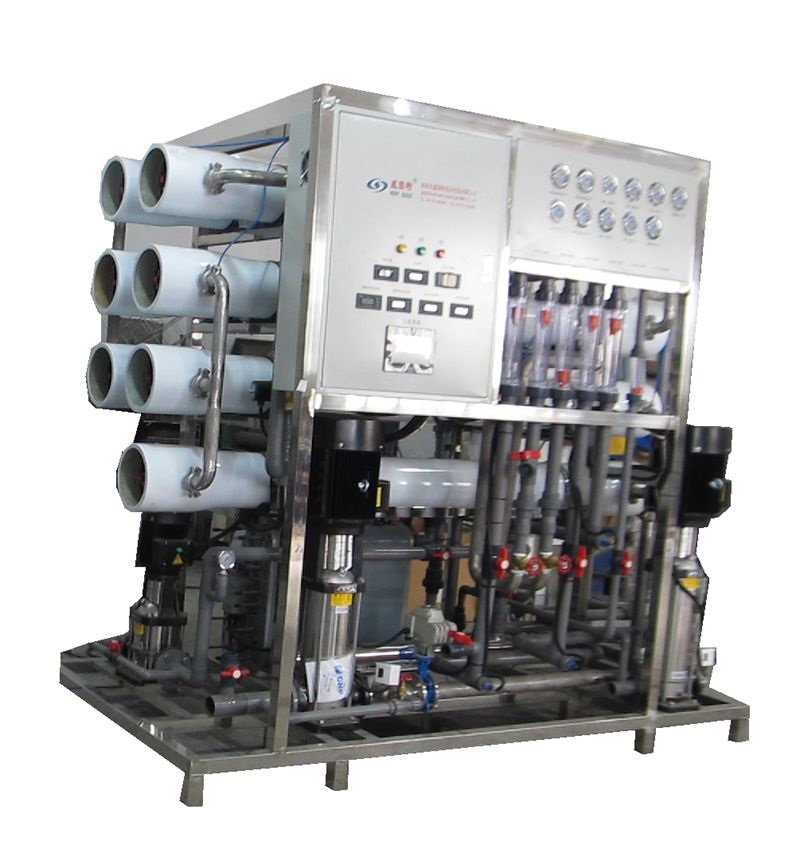 市政自来水→原水箱→原水泵→石英砂过滤器→活性炭过滤器→保安过滤器→过滤水箱→一级增压泵→一级RO反渗透→中间水箱→二级增压泵→二级RO反渗透→纯水箱→纯水泵→0.45μ过滤器→TOC脱除器→EDI装置→抛光混床→0.22μ精密过滤器→用水点