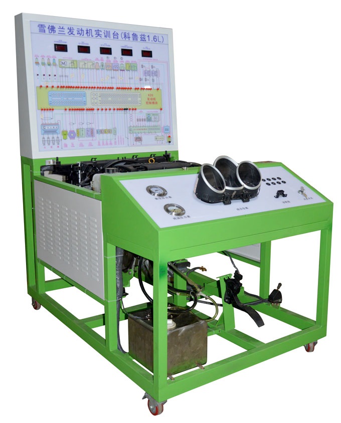 发动机总成、原车发动机电脑、组合仪表、发动机起动运行所有相关的原车附件、故障设置和排除系统、原车电路原理图及检测端子、大容量蓄电池、不锈钢油箱、发动机加速机构、控制台、可移动台架、台架电源总开关、诊断座、散热系统、数字显示表、燃油压力表、真空表、带锁止的万向脚轮等。