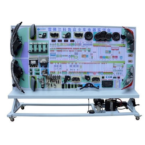 (2)实训台将全车电器以平面的形式展开,各系统按原车相对位置摆放固定,线路清晰明了,与原车系统一致,检测方便,操作简单。(3)实训台面板上安装有检测端子、可直接在面板上检测各传感器、执行器的电信号,如电阻、电压、电流、频率信号等。