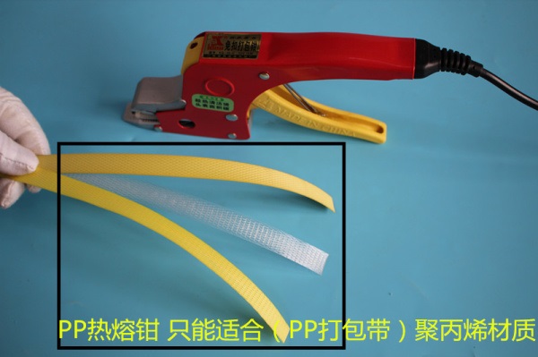 1、通电指示灯亮,约30-60秒烫头冒热气即可工作,手持钳把将烫头伸进两条PP塑料带之间。