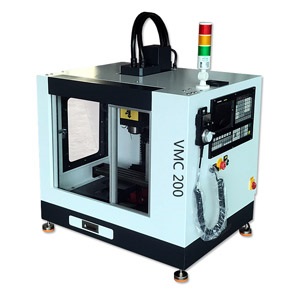 VMC200是一款使用220伏电压的桌面型加工中心,占地小、重量轻;主要用于智能制造工业互联网生产线教学项目及FMS柔性制造工业机器人上下料加工单元,机床联网等;机床设计有自动门及32个路IO端口便于与工业机器人通讯,支持上位机通过网口读取系统状态数据,如转速、位置、坐标及远程传输文件功能等。采用全封闭安全设计结构,配置工业数控面板数控系统;4工位换刀系统,使用气压0.6Mpa,主轴采用高速精密主轴单元。用于铣削雕刻及钻孔加工,主要加工黄铜、铝合金、PVC塑料等材料。
