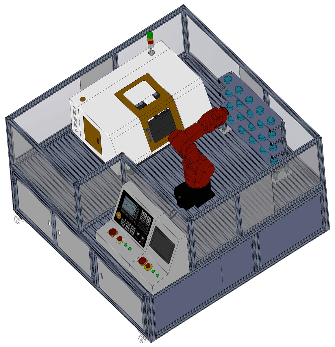 工业机器人从仓库取出原材料,由6自由度工业机器人送置数控车床端,数控车床自动打开门,机器人送料置数控车床上夹紧材料,机器人收到信号离开机床端,数控车床的自动关上门开始车削加工,零件加工完毕后,机床自动开门,零件由机器人送置仓库成品区。学生在熟练掌握该系统的操作与编程以后,也可以对零件类型和加工工艺进行调整。