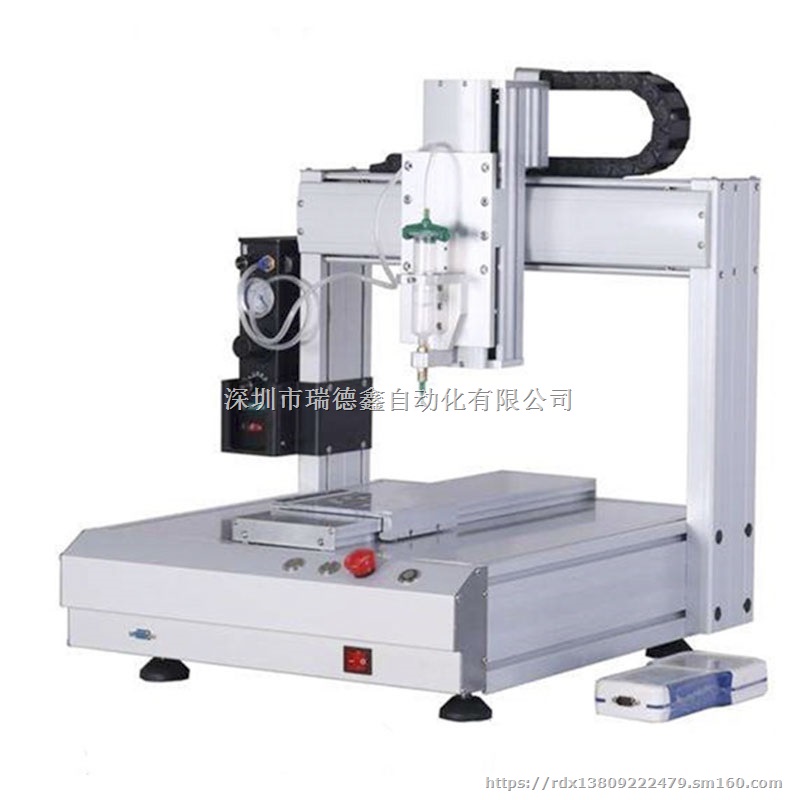 瑞德鑫双液混合自动点胶机引入大比例AB胶水可搭载双组份泵送液系统自动混合搅拌技术,提高胶水的精准融合度,保障混合胶水比例一致性好,粘连密封效果更有效。坐标点位编程操作方便易学上手操作简单快捷。双工位换料平台一边点胶一边上料加工效率不耽误。平台机身设计可搭入流水线或装配线小巧不占地。选配落地式自动点胶机,人性化设计操作方便不弯腰不累人。