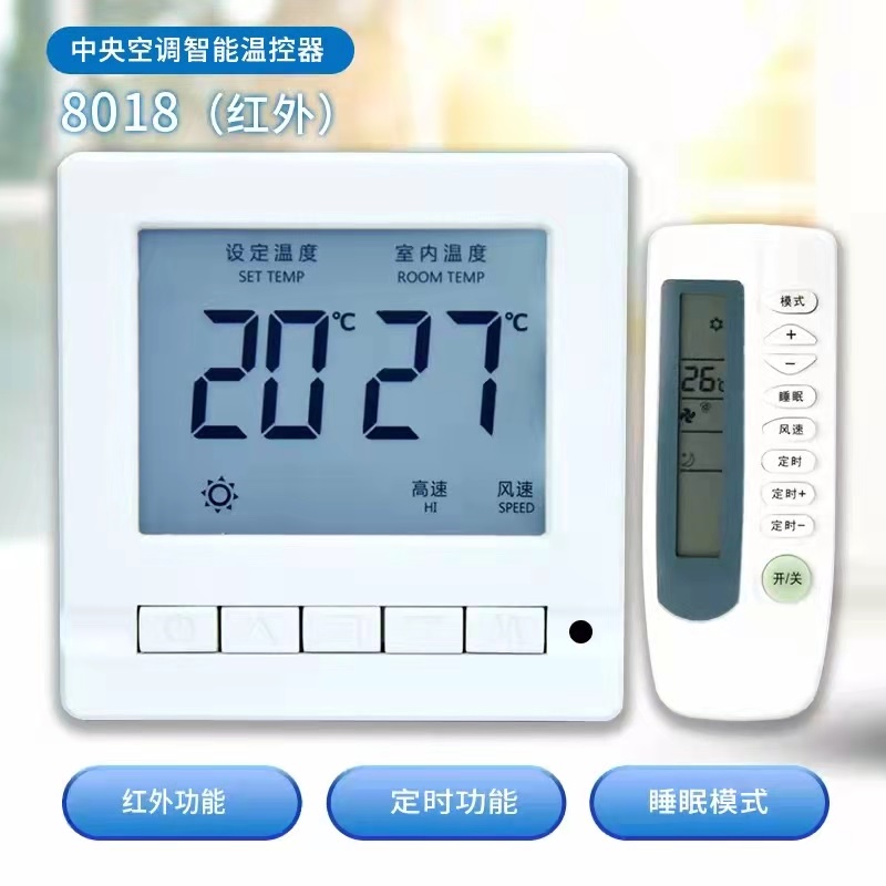 8018温控器是一款中央空调风机盘管温控器,可通过键盘操作实现定时开关机,模式切换、风速调整、锁定、恒温温度设定等操作。