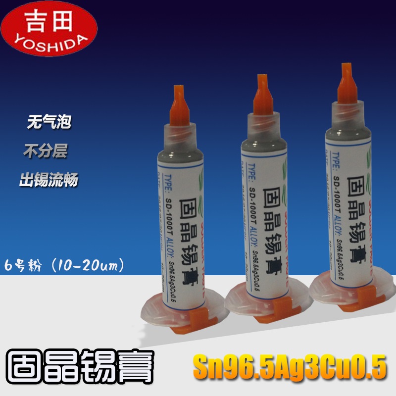 产品特点:具有固晶及点胶所需合适的粘度,分散性好;粘接强度大,工作时间长;残留物极少,焊接平整;超微粉径,能有效满足25-75mil范围大功率晶片的焊接;固晶锡膏的成本远远低于银胶和Au80Sn20合金,且固晶过程节约能耗。