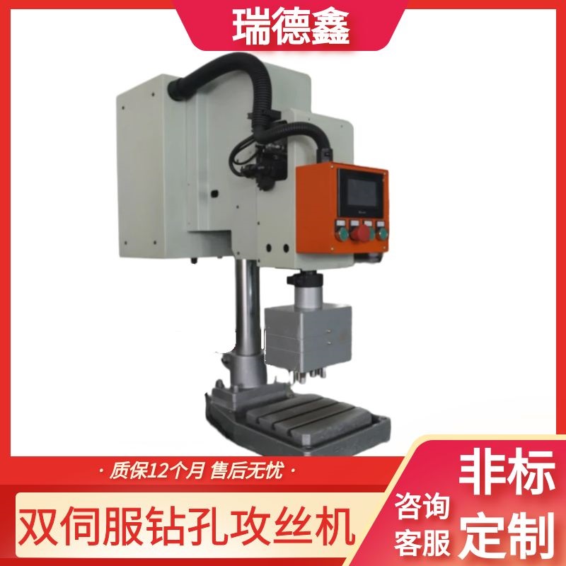 瑞德鑫多头钻攻一体机采用双伺服电机带动,可对不同硬度材质进行打点、钻孔、倒角、攻牙、回牙。比如树脂、塑料、锌合金、镁合金、铝合金、铜、铁、钢、合金、粉末冶金等都可进行螺纹切削。