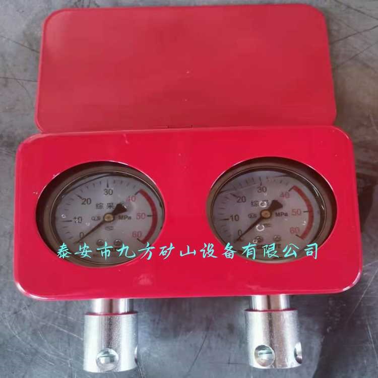 泰安市九方矿山设备有限公司生产的综采测压双表具有实时监测综采液压支架的支撑工作阻力,以便掌握该工作面的工作压力和支架支护质量,有效的检测支架压力和顶板来压防护。由高强度、耐腐蚀、抗静电外壳和抗震压力表组成,具有防锈、外观美观、精度高、抗震、可长 期在井下使用,无需进行维护等特点。