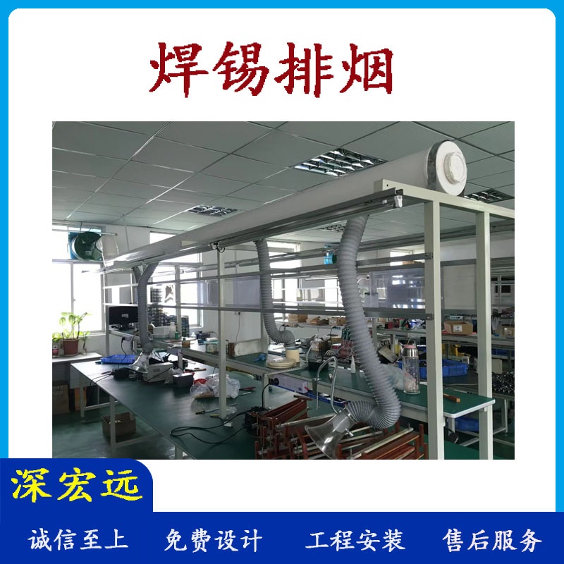 波峰焊、回流焊、手浸锡炉、电铬铁手工焊等,是电子生产车间中必需的生产工序之一,“锡”是主要的焊接材料,作业过程中会使用松香或含松香成份的助焊剂作助焊,焊接时锡和松香熔化会挥发出浓烈而又刺鼻的含铅有害烟气,长期吸入含铅烟气,对人体损害较为突出。此排烟系统将根据生产设备及流水线的布置,进行现场数据采集,逐一对生产设备及焊锡工位的排烟量、所需静压等参数进行设计,从而达到解决电子焊锡烟雾的吸收与排出室外。