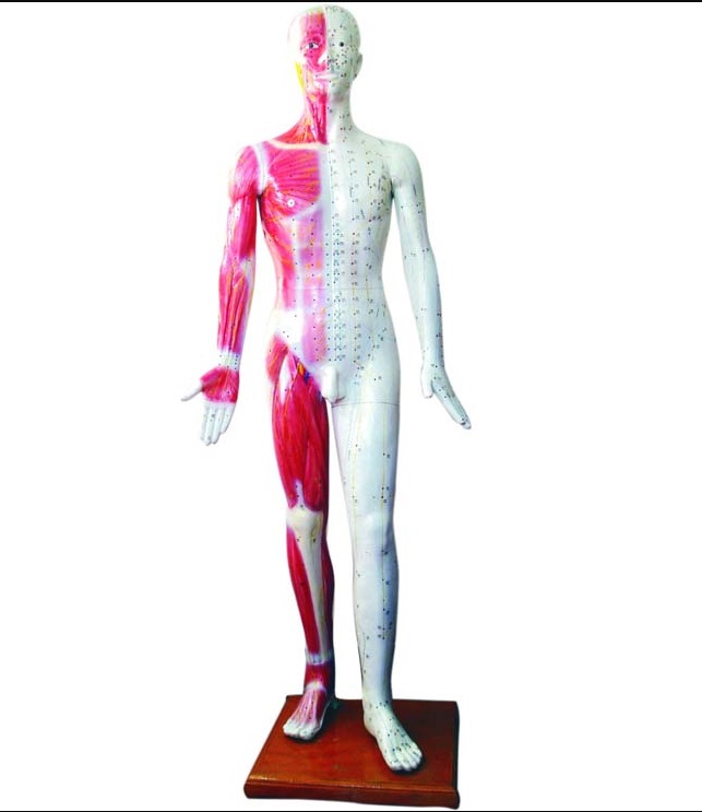 这款彩色的塑料模型非常详细地标明了14条主要经络线,身体右侧是361个经穴和48个经外穴以及骨度线,即用“寸”来方便地测量针灸点之间的距离。身体左侧是皮下组织,显示神经系统分布、动静脉、血管和肌肉构造,还标明了在主要经络线上没有标明的手足部的经外穴。适用于中医教学、针灸和推拿等。用玻璃钢制成。尺寸:178CM高。
