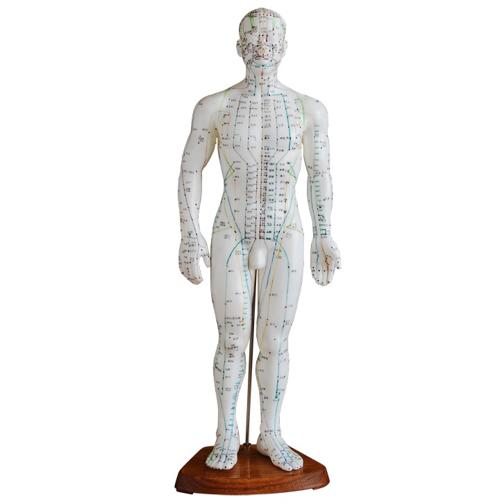 本模型用亮色PVC制成,安放于底座上。标明了经络线上的361个针灸穴位和48个经外穴位,由著名的针灸专家和中科院院士对穴位进行定位和核准。模型左边用英文显示(如HN3,ST17),右边用中文显示。附中英文使用手册。用软PVC制成。尺寸: 50CM。
