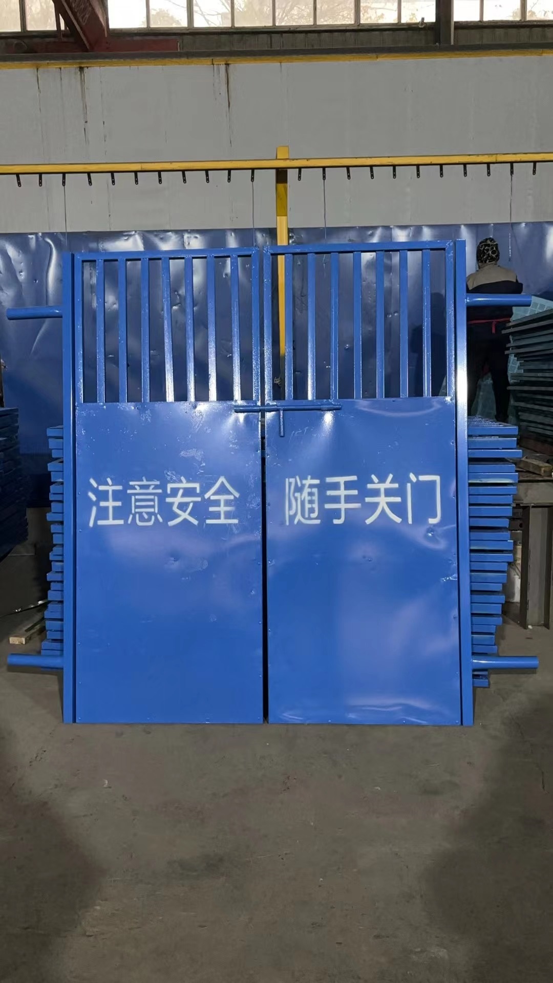 电梯井口防护门是为了防止工人在高空作业时不小心坠落用的防护设施。