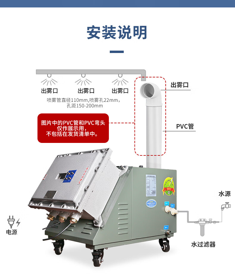 - 防爆设计:超声波防爆加湿机的所有电气部件,包括电机和控制器,都采用了防爆设计,以确保在潜在的火灾或爆炸环境中提供*的安全性。