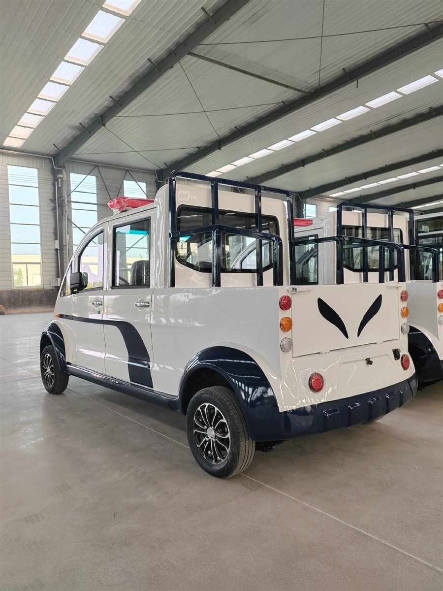 设计上,悍逸电动巡逻车更是充分考虑了巡逻工作的实际需求。车身采用轻量化材料打造,结构紧凑、坚固耐用,既减轻了车辆重量,又提高了行驶稳定性。同时,车辆还配备了宽敞的车厢和舒适的座椅,为巡逻人员提供了良好的工作环境。此外,悍逸电动巡逻车还具备优异的载重能力和灵活的转弯半径,能够在各种复杂环境中自如穿行,满足各种巡逻需求。