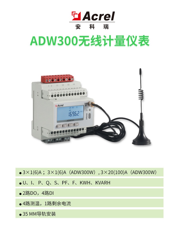 ADW300 无线计量仪表主要用于计量低压网络的三相有功电能,具有体积小、精度高、功能丰富等优点,并且可选通讯方式多,可支持 RS485 通讯和 Lora、2G、NB、4G 等无线通讯方式,增加了外置互感器的电流采样模式,从而方便用户在不同场合进行安装使用。可灵活安装于配电箱内,实现对不同区域和不同负荷的分项电能计量、运维监管或电力监控等需求。
