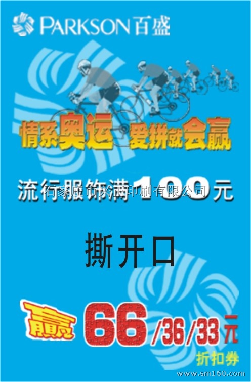 促销奖券亦称奖卡、幸运卡、刮刮卡,特制奖券是依据客户需要而特别制作的独家促销专用奖券。其形式一般有两种:一种是即开型奖券。也就是当消费者购物时,附赠一张奖券,即买、即开、即兑、即奖。它的特点是直观、简捷、易操作;二是多次开奖型奖券。它设有多个撕(刮)开区,适用于多次开奖、集卡或游戏抽奖等促销活动。多次开奖型适用于促销力度大,轰动效果明显的促销方案。